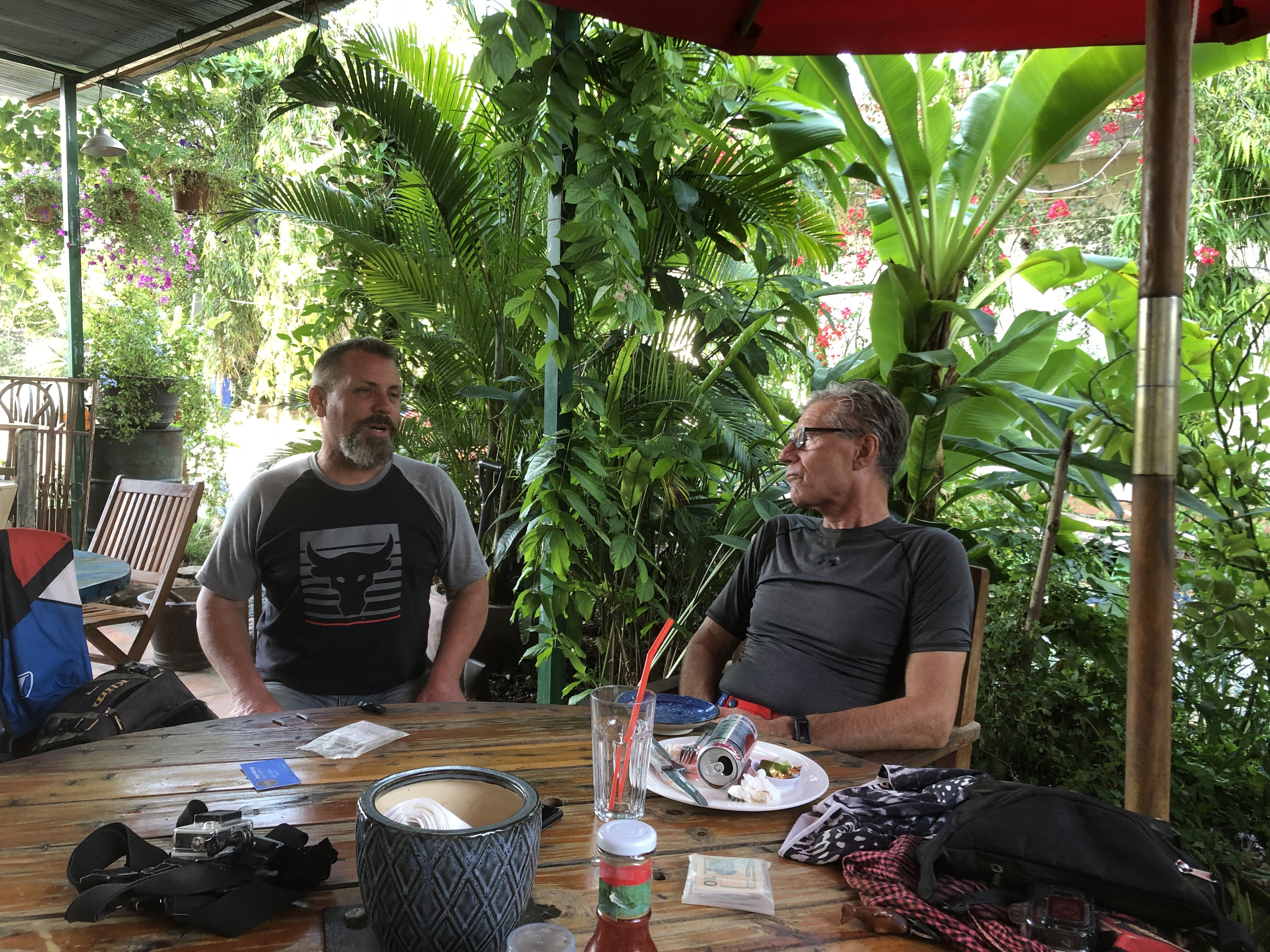 This coconut stop was one of the highlights of the trip for me. As soon as we pulled up to the little stall, the men sitting and having coffee and smoking started talking about us in Khmer. This is pretty typical - foreigners on massive dirt bikes is big news! Dennis made a comment in Khmer, basically, along the lines of, “I speak Khmer.” This got the guys super excited and they invited us to sit with them. From there, Dennis explained that we were going around praying for Cambodia - for good business and relationships. I was trying to follow along in Khmer, but I was distracted by something with my boot. I look down and the man sitting next to me was playing with my boot buckle! I started joking with him and took off my boot for him to try on! This kicked off the most intense inspection of my person. He inspected my boots, my body armor, my Cambleback, my Chesty-mount Go Pro (that was a little alarming but having body armor helped) and finally my industrial earrings. The entire time, the guy is only speaking to Dennis, which makes sense from a cultural point of view. Finally, the man informed Dennis that I must be a ក្នេងស្ទាវ (gangster)! Dennis did some saving face on my end and I think the conversation ended with him agreeing that I’m American and a girl and things are a little different for American girls then Khmer girls. And I learned a new vocab word! From there we continued on to our destination for the night. Stef and I got to try river lobster for the first time and it was pretty good!