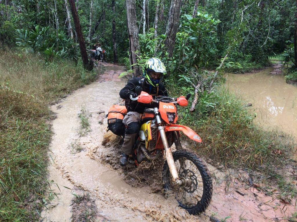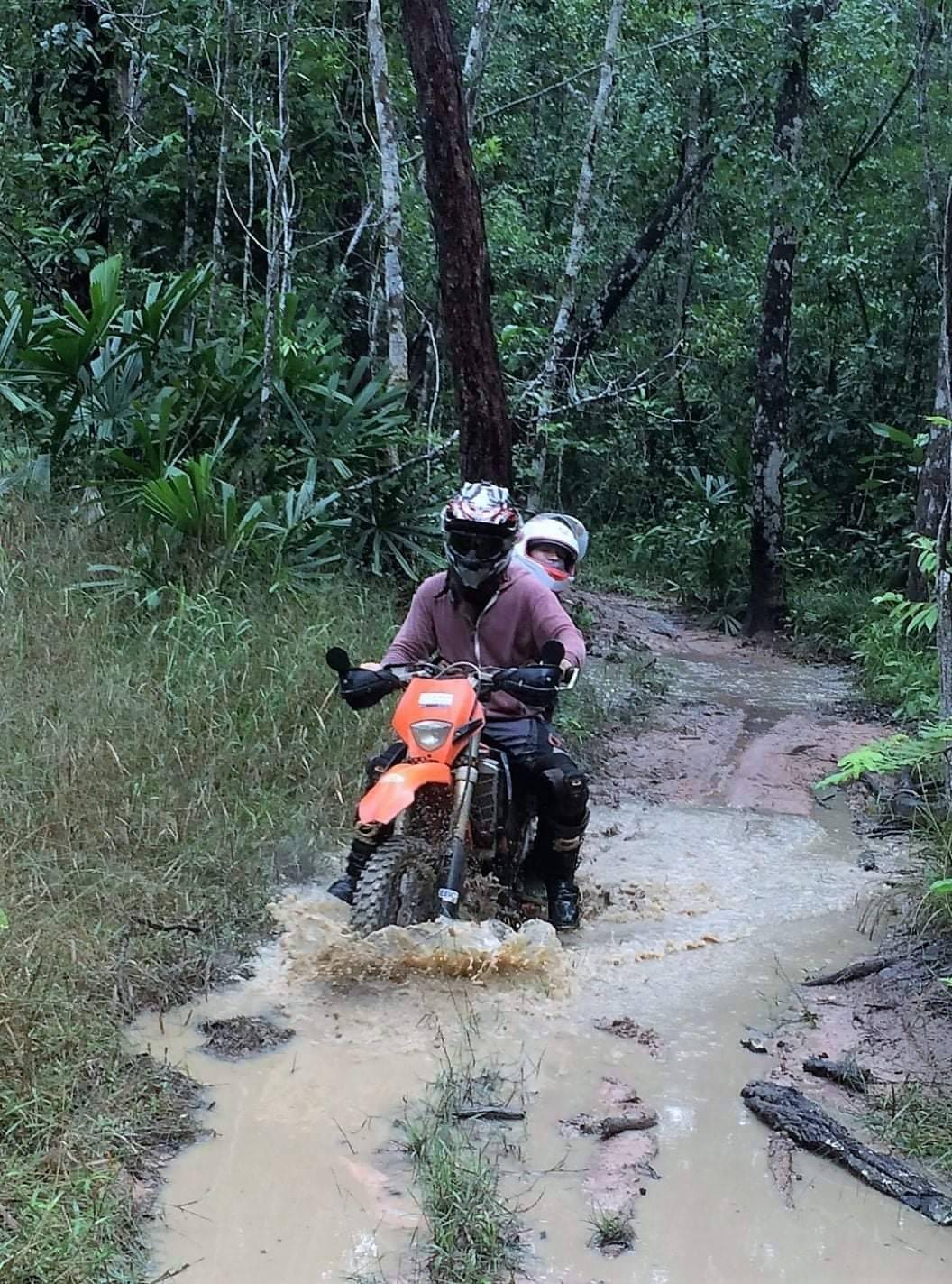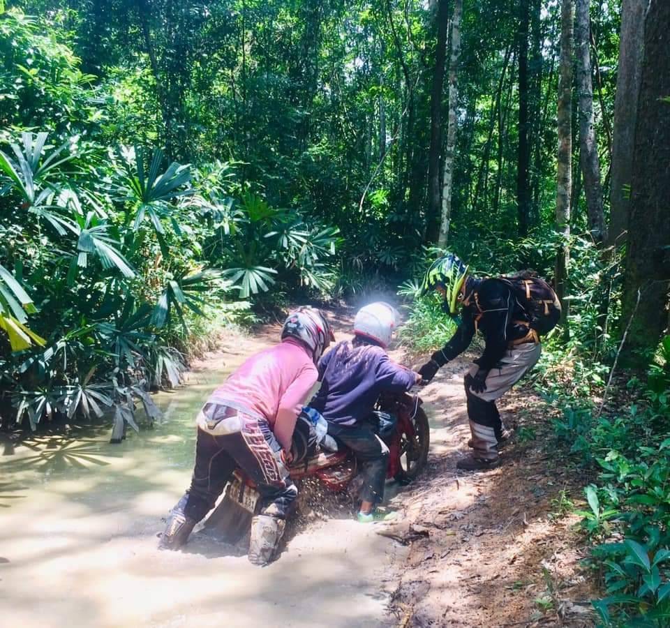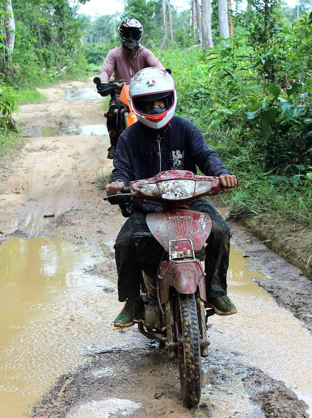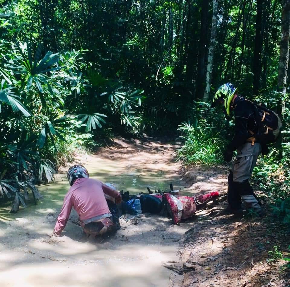 The next morning the roads were very muddy from rain earlier in the week, but we pressed on and stopped at the police checkpoint to visit with the soldiers and restock some of their medications. Soon after we left this checkpoint the gear shifter on Aditiya’s bike broke oD so a group of three went back and got the lever welded back in place. Soon after we started rolling again but kept having breakdowns and crashes that really slowed our progress down. For two young men that came with Curtis, this was their first time to ride a moto ever, much less navigating the water traps and mud holes. This duo was motodoping each other along the jungle trails and they crashed their Daelim multiple times throughout the day. Many of these spills involved the tailpipe going under the water as well. This made it diDicult to get the engine running again on this small chicken chaser. Since they hadn’t ridden a moto very much, it was very diDicult for these guys to kick the bike back to life again. After the moto had been rescued from the clutches of the mud hole, they would do their best to get the engine running, however most of the time Curtis or one of the other more experienced riders would oDer to kick it back to life. The bike would stall often due to the diDicult terrain and water in the system. Every time the engine stop it would take the eDorts of several people to navigate the obstacle and get rolling again.