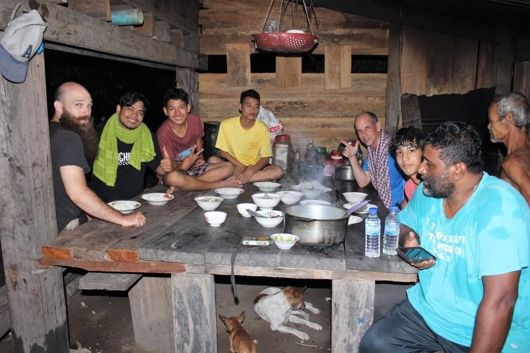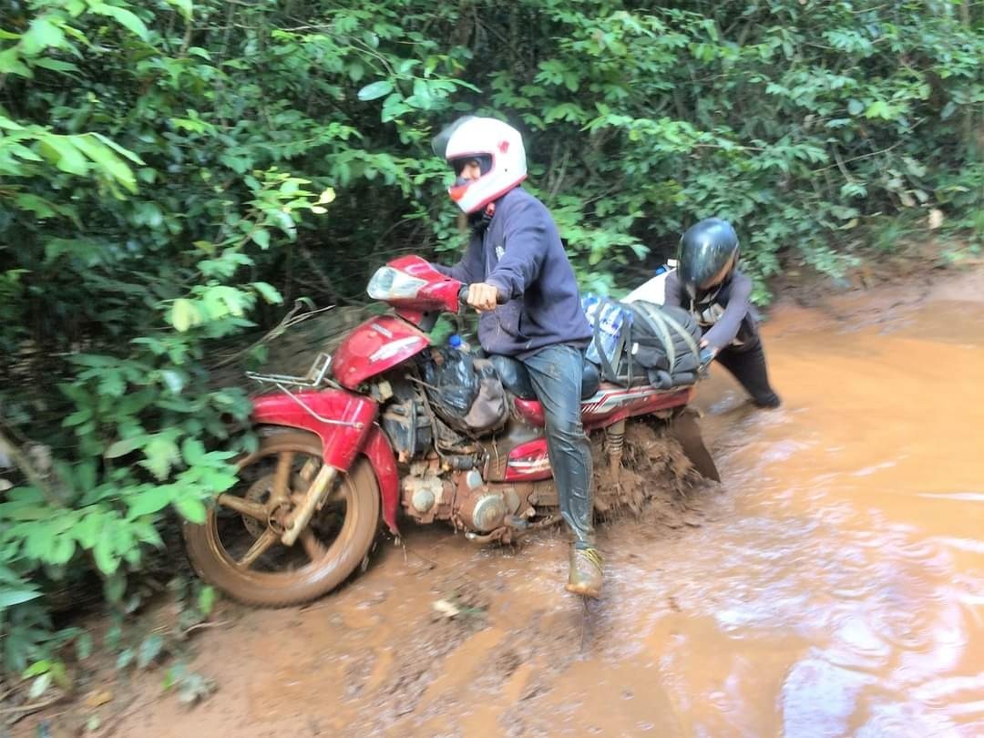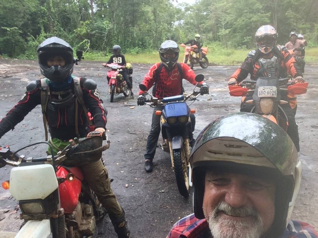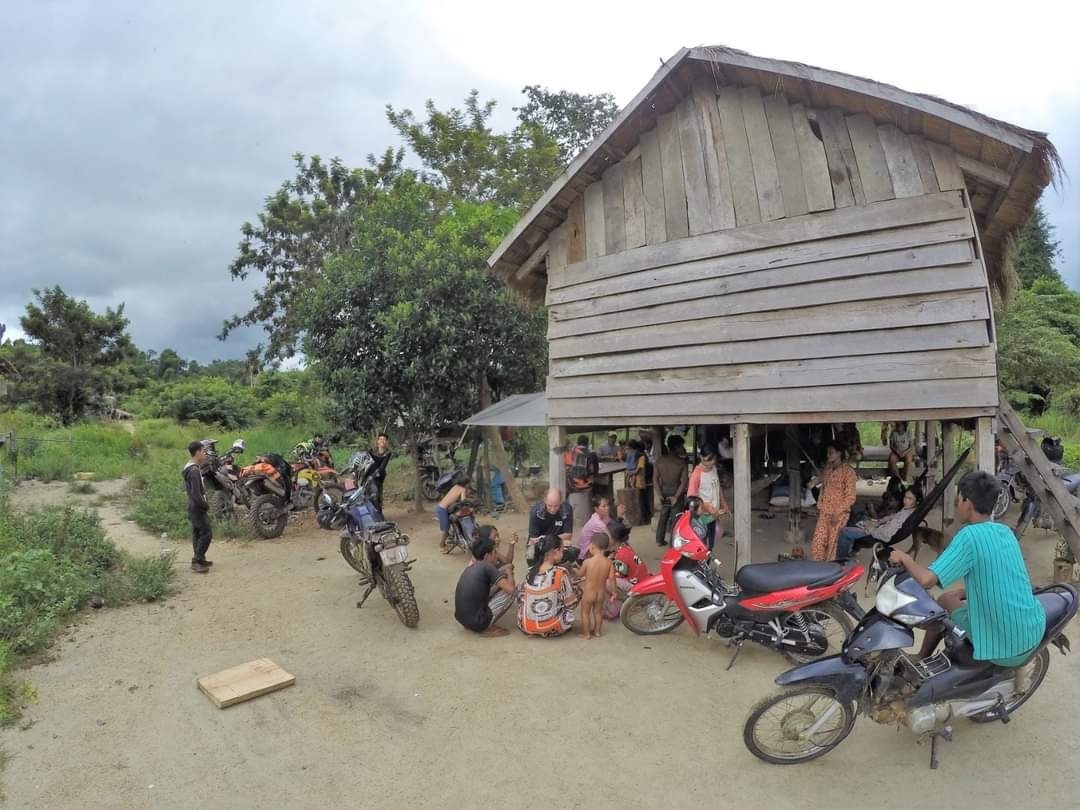 We still had a couple of more hours to make it to the village where we were planning to spend the night. We rolled into there about 8 pm in the dark and it had been raining on and oD throughout the day. All riders were wet with rain and sweat from towing, moto mud/water rescues and kicking bikes to keep them running to the next stop. The family in this village weren’t fully aware that our group would be there that night, but they did their best to accommodate with food and dry spots to sleep. When the food was finally ready, the two young men who were riding in the jungle for the first time, were so hungry that they each ate several full bowls of rice. There was not much chicken or vegetables for that meal but they got their fill of rice and seemed very happy and content to go to bed right after supper as we all were drained physically.