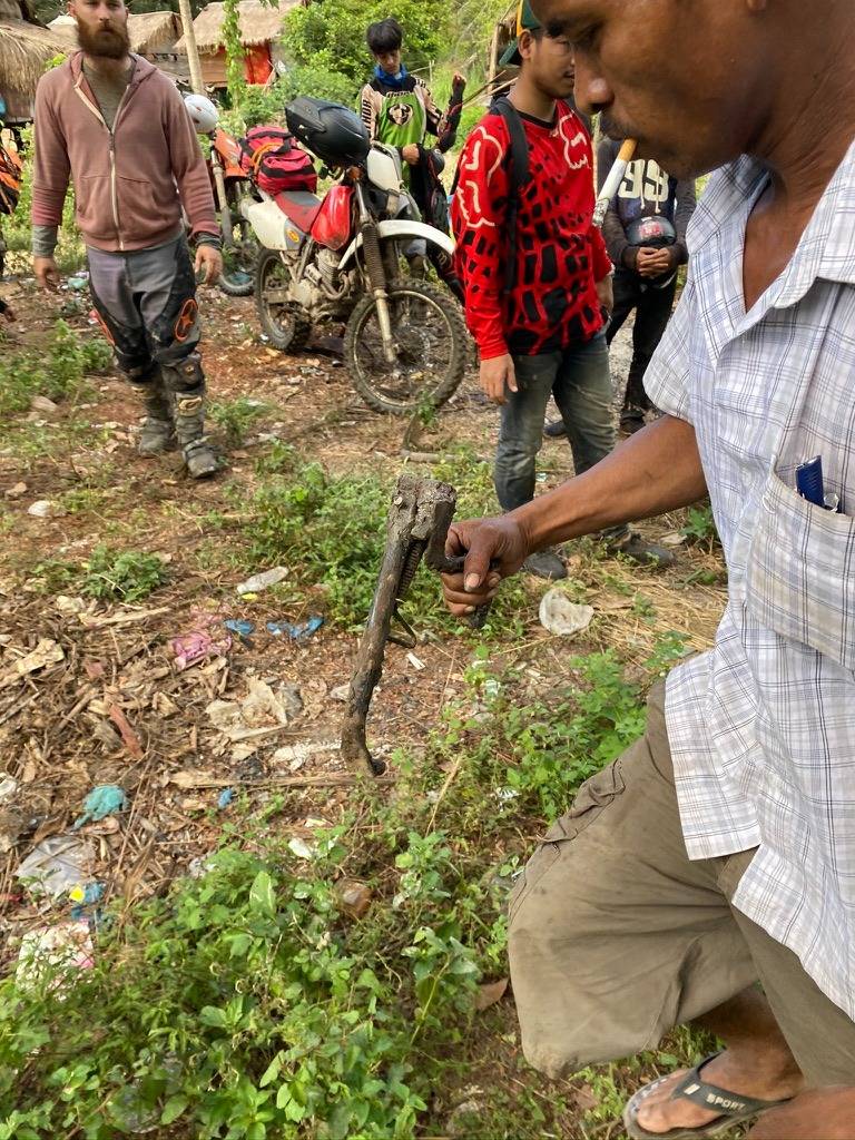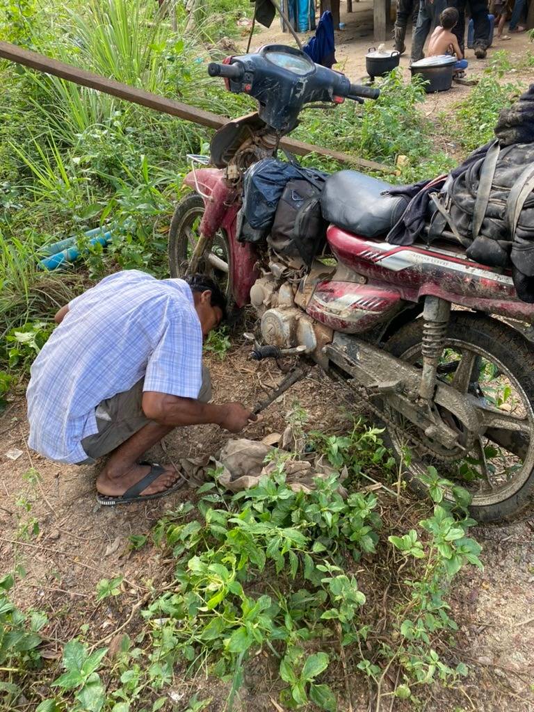 We continued our circuit to make the normal rounds of visiting with people in Klien Poa, Oyee Oh, and Japon villages. As we made these stops, the people at each location were so very appreciative for us to make the eDort to reach them with the jungle being flooded and the overall diDiculty of travel. We would limp into each village and ask if anyone could help us get our bikes back in working order. We also had to tow incapacitated motos as sometimes we could not get them started along the trail. A few of our diDiculties: Daelim footpeg and kickstand broke oD (welded back), Daelim drowns and we tow it to next village, Daelim spark plug cable repair, Adi drowns XR, extended tow/crash to get XR going again, multiple puddle crashes.
