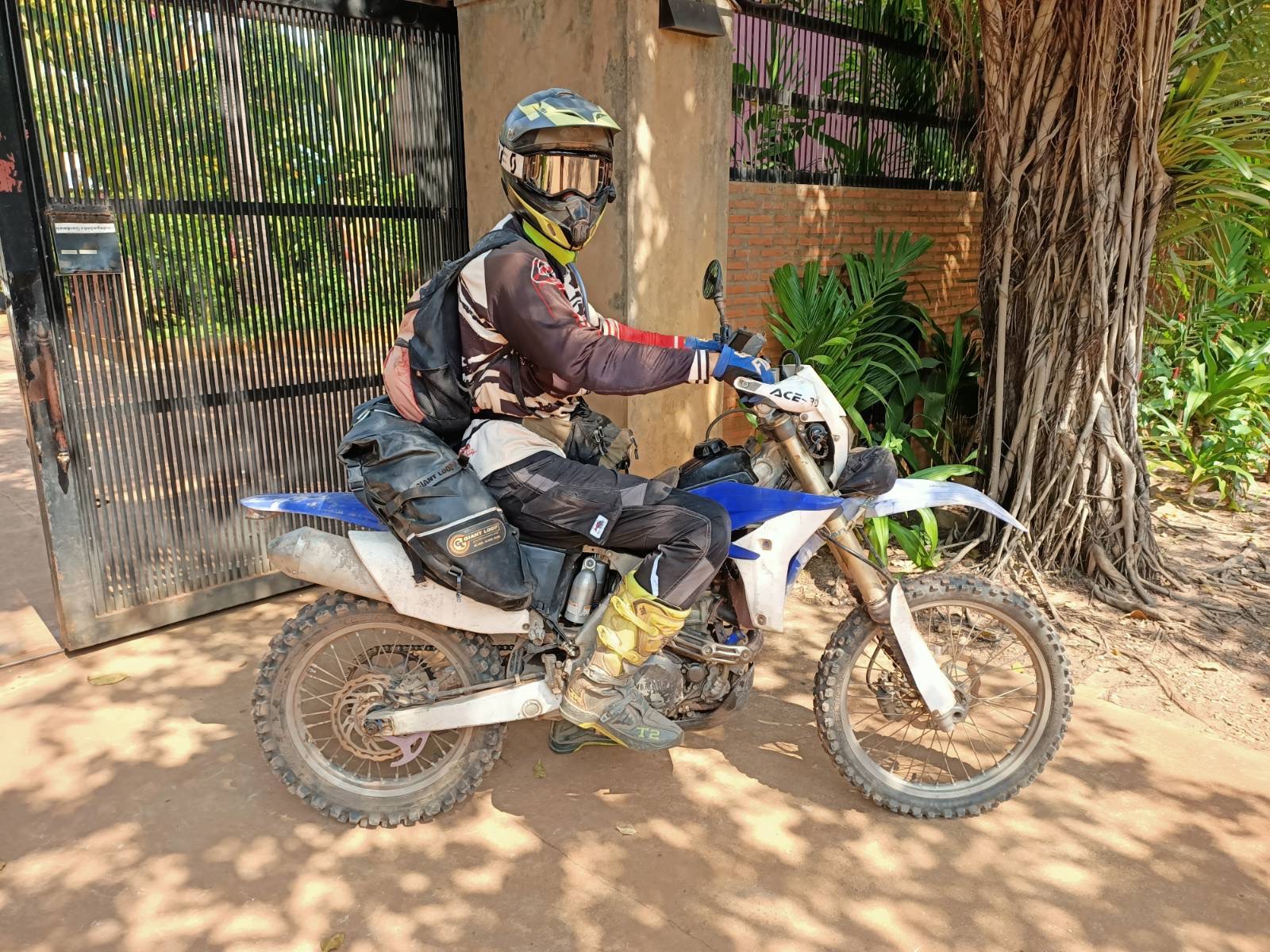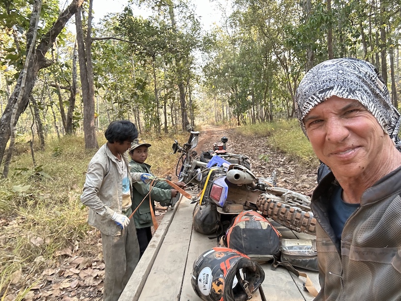 On the track to Vansai there was a lot of sand and rough terrain. We ended up stopping to rest for a short time into this track and after some water and rest, we were ready to go again. Everyone takes off except Luke and myself as I have trouble getting my bike started. I try for 20 min to get the bike going but can’t get it to kick over. Initially I was using electric start but as the battery got weaker, I had to kick it as I was trying different fuel strategies to get it to start. When none of that worked, we pulled out a tow rope to see if a roll start would get her going. The sand was very deep at this point so I was not sure how this would go. About that time Peter and Sergey show up. Peter hops on and tries a few strategies and finally she kicks over and starts. We catch up with the group a short way down the track and Dennis and I get waved on by the group so as not to have to shut down my moto for fear of it not starting again. We start out and it seems like everyone is traveling with us close as I see two bikes in my rear-view mirror. Pushing forward, we are moving at a steady pace when my moto just dies like it has run out of gas. We decide to wait for the group because if I started the bike then I would want to take off right away. We waited about 30 min and found out some people had crashed in the sand and delayed their progress. When we were all together again, I tried to kick Wynona to life, but it was futile. Peter tried again but to no avail. I think it ran out of oil and the overheating depleted the water in the radiator and blew the head gasket thus causing all the damage. About that time, a 2-wheel tractor (Go-yuan) with a trailer was coming down the path. They said they could take me to the police station in the forest, about 8 km down the road, for 30,000 khr ($7.50) and then I could negotiate with the owner of the tractor to get to the ferry crossing in Vansai.