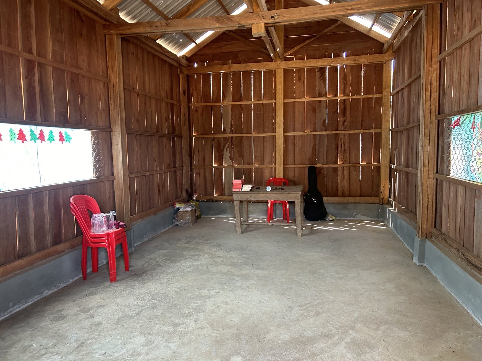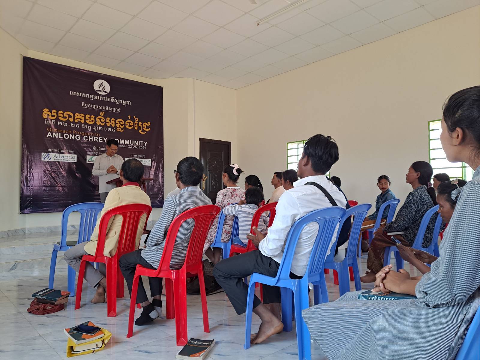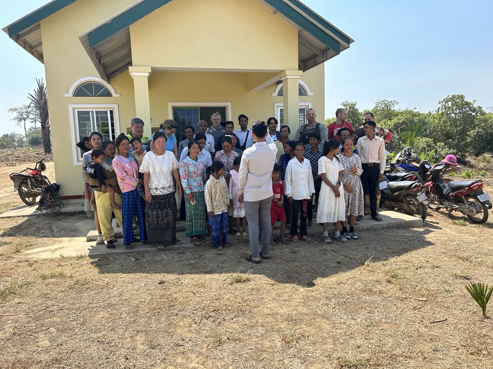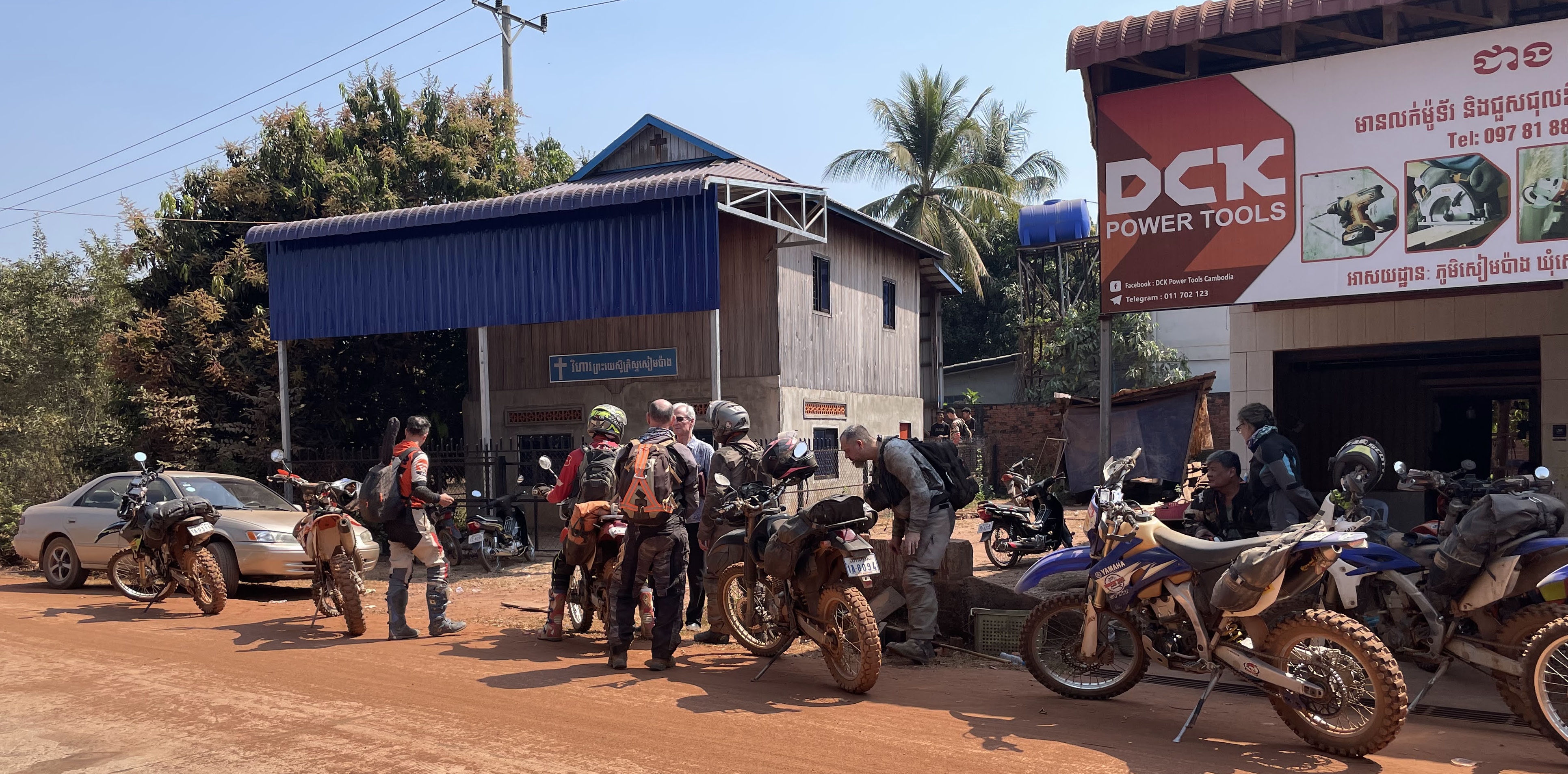 We made a loop to see several churches that Jared had pinned for us close to Stung Trang. Our first pin was for a place called Moen but people around this location did not seem too sure of where this group met. They told us it was behind their house, but when we went back there, we only found a cassava field and the workers there did not know anything about a group meeting in that village. After a short while, someone came by on a moto and said he knew where the church was located. We followed this young man several kilometers to a 7th Day Adventist church that had just been built by a Korean group in November of 2023. I don’t think this was the church that was associated with the first pin at Moen because it was so far away and pastor John at the 7th Day Adventist Church in Anlong Chrey had not heard of any group meeting at the Moen location. The church building was built for this group by Koreans with no strings attached as far as responsibilities for working or reporting to the Koreans. John had been the pastor for a couple of years and was anticipating being moved to lead another fellowship in a couple of months. A new pastor would then be assigned to lead this group in Anlong Chrey. Being a 7th Day Adventist Church and this was Saturday, they were holding a worship service when we arrived. They invited us to join. We slipped off our boots and tried to slide in the back, but the intrusion of 8 foreigners in moto armor was difficult to go unnoticed. Yong introduced our group to the fellowship as the service resumed. Pastor John preached a sermon on the feeding of the 5,000. Before the service was over, we tried to slip out. As we geared up to take off, we paused to pray for this fellowship and then take a group picture. We were able to visit briefly with the church members as we said our good-byes to get on the trail again.