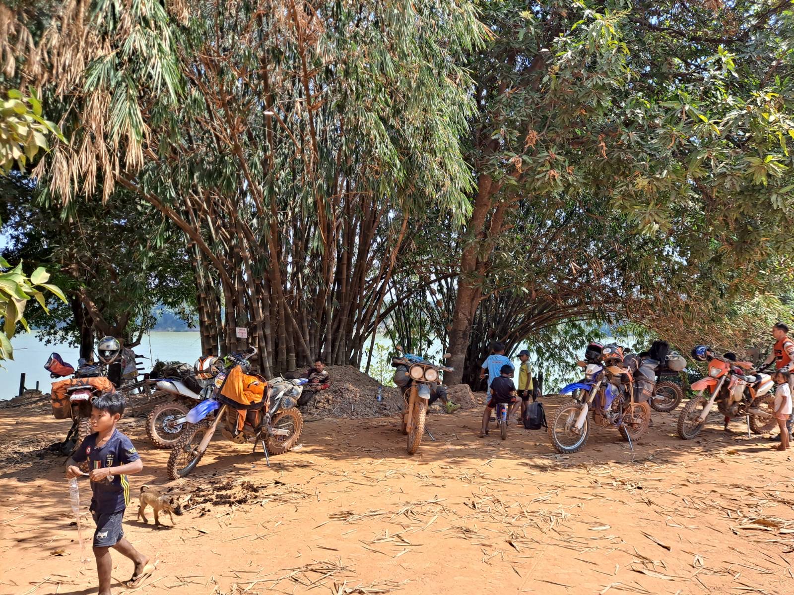 Meanwhile 20km up the road, Sergey’s battery had died, so he, Peter, and Luke stopped at a house asking the road to try to buy a used battery out of a local’s moto, while the other riders pushed on to Banlung (Philip’s moto was being stubborn to start and they thought it might be an ignition coil issue so they didn’t want to shut it off). Sergey successfully bought someone’s moto battery from them and got it installed. They weren’t sure if Sergey’s moto was charging the battery, so he left his headlight off and instead Luke gave his portable headlight to Sergey to mount on his helmet to ride by. Peter and Sergey continued up the road to Banlung, but we agreed that Luke would ride back to the ferry crossing where we were to help with the night-time tow up the dusty road to Banlung.