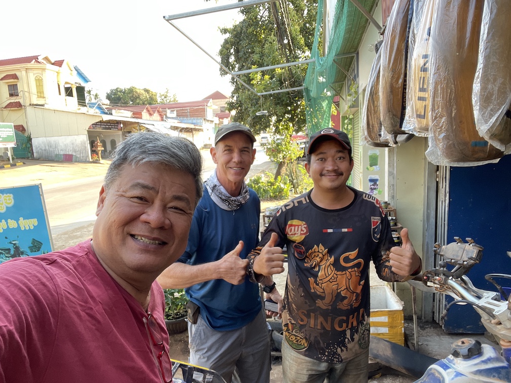 I was out the door at 6:40 to see about what could be done for my moto. I took off my tank bag and saddle bag and Yong came out willing to give me a tow to a shop. I had asked the guest house clerk where a Cheung for big Motos would be and so I had Yong tow me there. The Moto repairman was gone for a funeral, but Dennis messaged and said he had found someone to help him with his headlight and maybe his cheung could do something for my bike. On arriving at Dennis’ Cheung, that guy sent us back to a Cheung a block away from the first guy that had gone to a funeral. This new guy looked legit and knew Sang and Leng. He spent about 5 hours working on the bike but in the end, he did not have the parts or ability to take care of the problem.