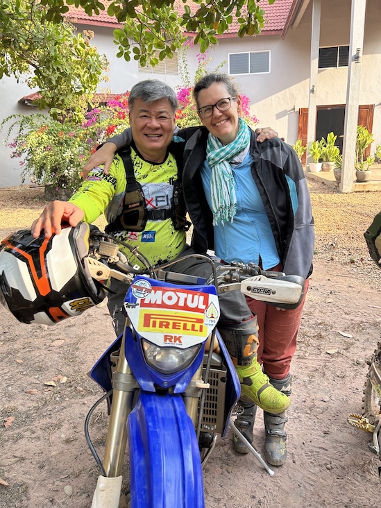 With the flat tire fixed, Dennis and I rode on to the turn where we left the main road and headed a half hour in to Philip’s village. With a flat-tire delay and a home-cooked dinner by Philip’s wife Kim on our minds, we turned off the main road a bit too soon and accidentally ended up on an old GPS track that wasn’t the good dirt road Philip led the main group down ahead of us. As darkness fell, Dennis and I found our dirt road devolving into a occasionally-used cart track that departed from our old GPS line. But we were both happy to end a “repair-shop-and-road-transit” day with a bonus adventure, so Dennis and I fired up our headlights and pressed on into the darkness. Several dry/sandy riverbed crossings and “that way feels about right” navigation decisions later, we rolled up to Philip’s house only a short while after the main group arrived. It was a good reminder that if you have a GPS pin of where you want to end up in Cambodia, it’s often possible to use intuition to string together farmers tracks to get there several different ways! Dinner was amazing, and Kim’s date cake with caramel sauce (paired up with a cup of Phillip’s coffee) is the stuff of legend. Seeing Kim bring food that delicious out of her kitchen that far in the jungle feels borderline miraculous to me! 😍